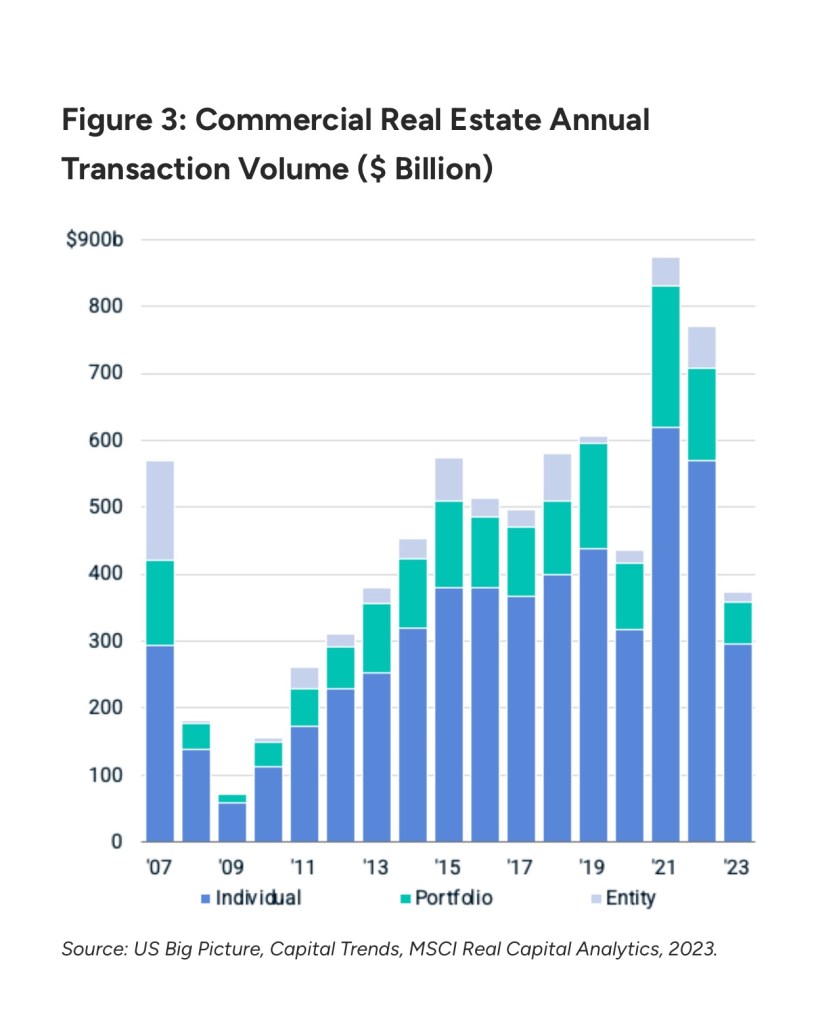 This shift became apparent in Q2 of 2022, with a market pullback and a drop in transaction volumes. Banks and lenders, facing interest rate exposure, retracted, especially as the office market faced distress. By spring 2023, a regional bank crisis, partly due to CRE exposures, led to a credit crunch, reducing lending capital and hiking borrowing costs.