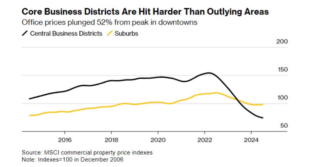 The U.S. commercial real estate (CRE) market is experiencing a significant divide. Central business districts are grappling with plummeting office values, while suburban and high-demand neighborhoods are thriving. From 2019 to 2023, U.S. office values have dropped by a staggering $557 billion, with central business districts suffering the most, seeing a 52% decline.