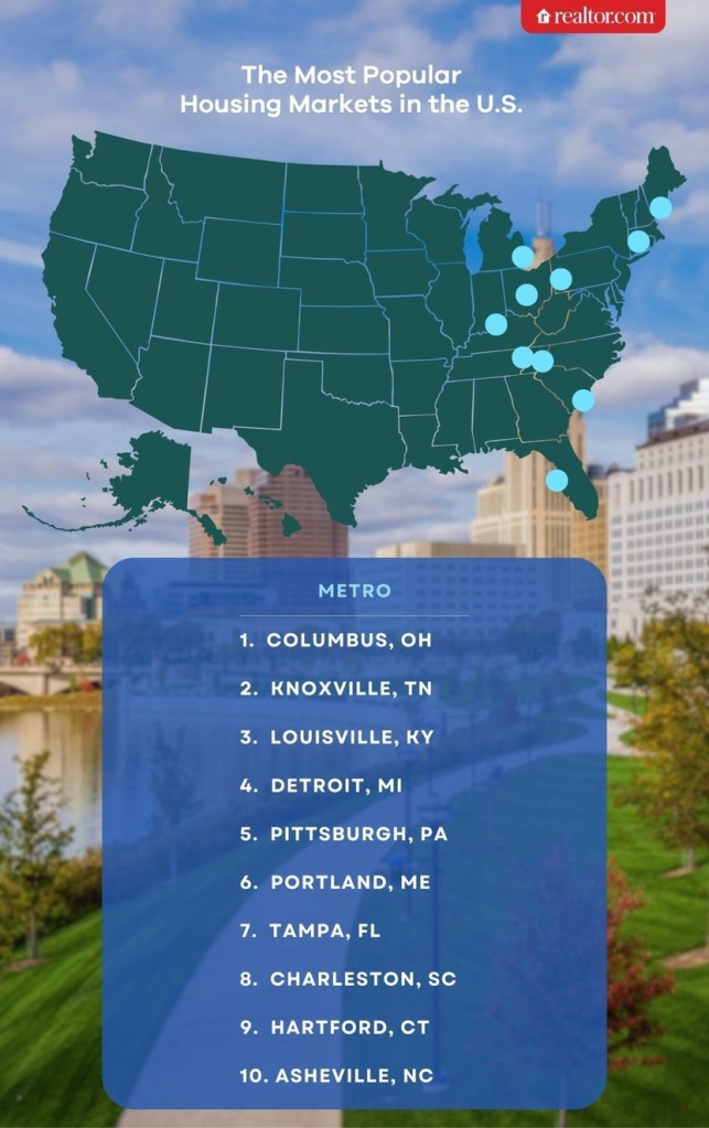 If moving to Columbus, OH, is on your to-do list, get your best offers in early because this Midwest city tops the list of the most popular housing markets in the U.S. for 2024.
