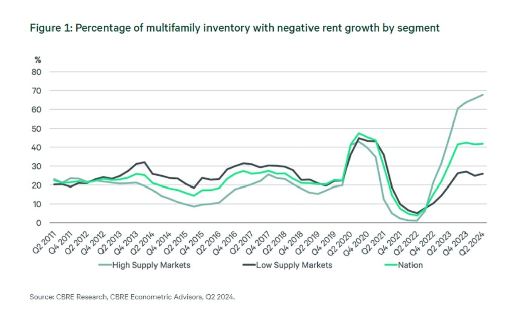 - Rent Growth: In Q2, nearly 70% of inventory in high-supply markets reported negative rent growth, compared to only 26% in low-supply areas. Despite this, about 33% of inventory in the hardest-hit regions maintained positive rent growth, showing resilience.