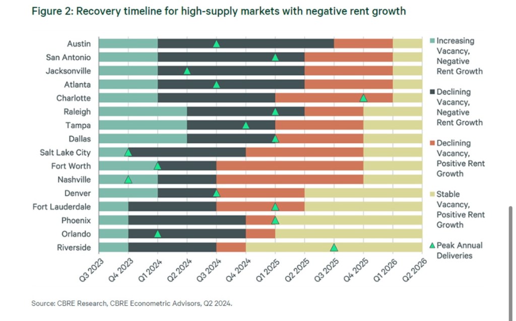 - Occupancy Rates: According to CBRE Research, occupancy rates are stabilizing as demand absorbs much of the new supply. Several high-supply markets are expected to see positive rent growth soon.