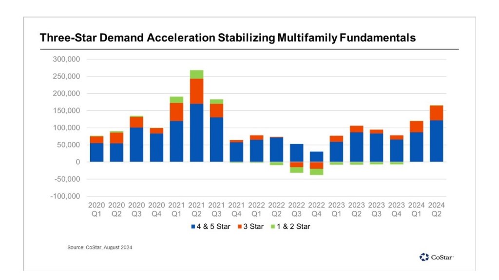Demand for mid-priced, three-star-rated apartments has surged in 2024, with absorption already exceeding last year’s total. According to CoStar, demand for mid-priced, 3-star apartments shot up 86% year-over-year in Q1 2024 and surged 126% from Q2 2023.