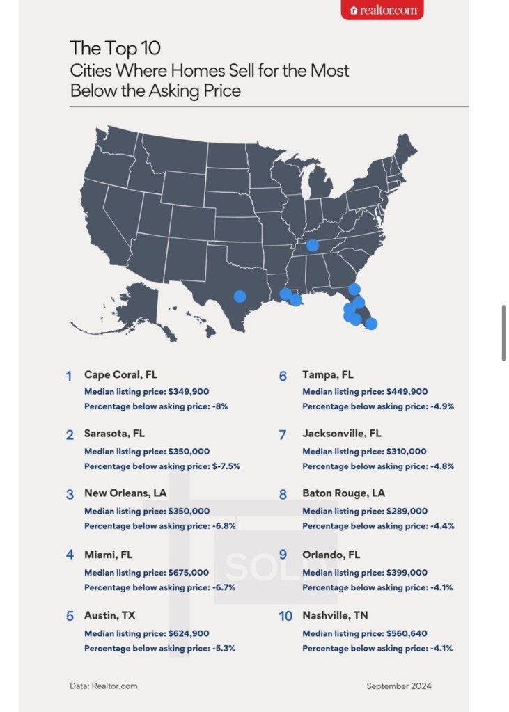 “All 10 of the metros where homes are selling for the most under asking are in the South, and six are in Florida,” says Jones.