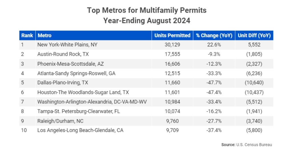 Despite the overall decline, some markets bucked the trend. Besides New York City, cities like Fort Worth, Greensboro/Winston-Salem, Asheville, Omaha, and San Diego reported more multifamily permitting this year.