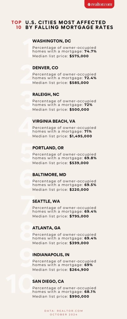 According to Realtor.comยฎ, cities like Denver, Raleigh, NC, and Baltimore are expected to experience a substantial impact from declining mortgage rates in the coming months. These cities have some of the highest percentages of mortgage usage, meaning a larger portion of residents are still paying off their mortgages compared to other markets.