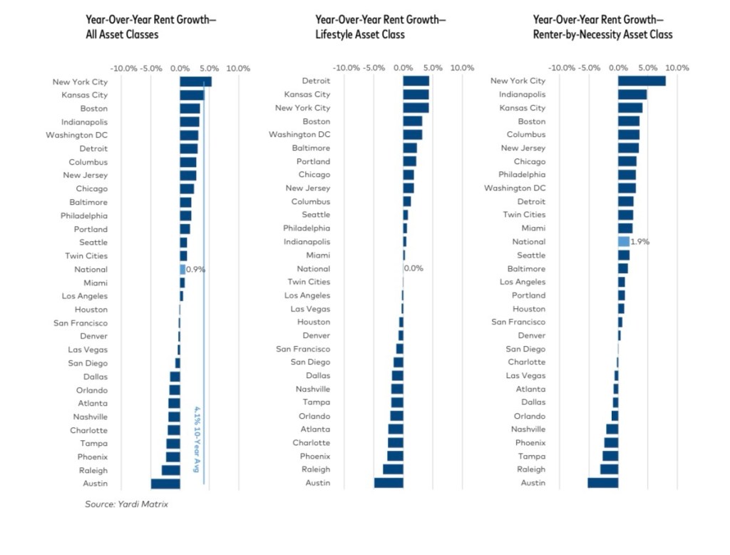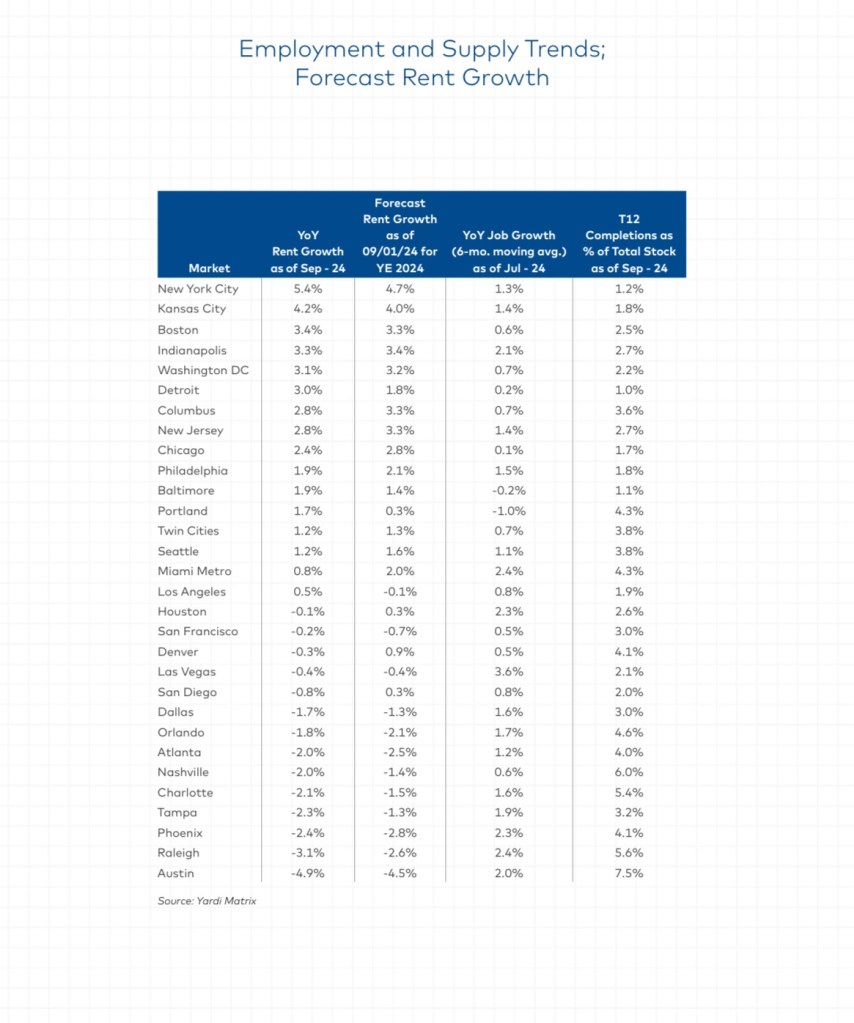 The report breaks down performance metrics by region, revealing variances in occupancy rates, rental growth, and construction activity. Key regions, such as the Southeast and Southwest, are experiencing significant demand driven by population growth and economic expansion. In contrast, some metropolitan areas are facing challenges due to oversupply and economic shifts.