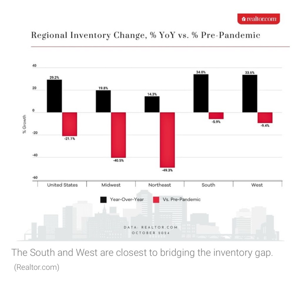 Active home listings are up across all four U.S. regions. The South leads with a staggering 34% increase, followed by the West at 33.6%, the Midwest at 19.8%, and the Northeast with a 14.3% uptick. Pandemic boomtowns such as Austin, TX, Memphis, TN, and Orlando, FL, are witnessing significant inventory growth, surpassing pre-pandemic levels.