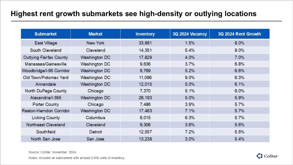 • Washington, D.C. Submarkets: Dominated the top 15 list for rent growth, demonstrating the resilience of well-positioned suburban areas.
