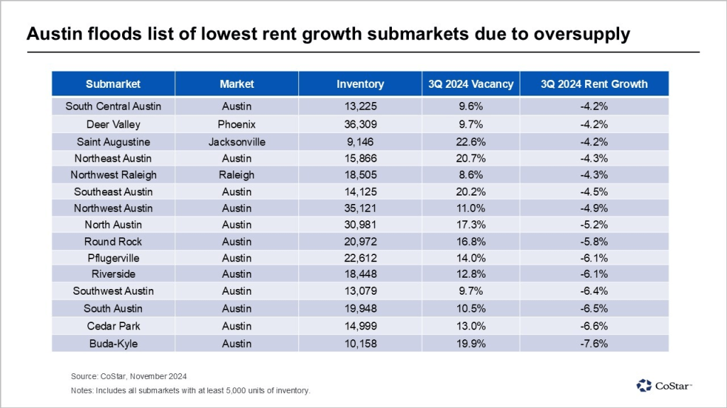 On the flip side, oversupply is dragging down rents in key markets, with Austin, TX, serving as the most notable example:
