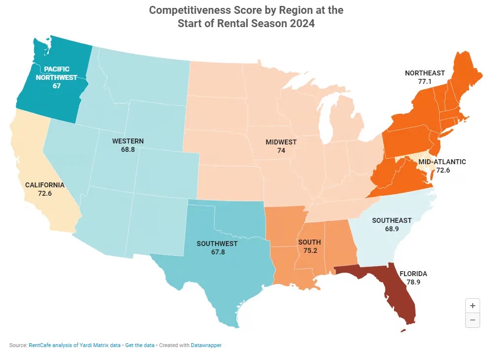 Despite a wave of new apartment deliveries, the rental market remained tight in 2024. According to RentCafe’s Rental Competitiveness Index (RCI), nationally: