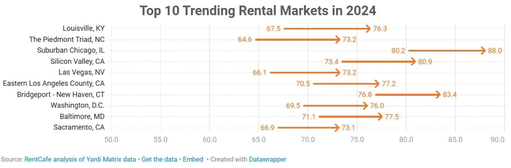• Louisville, KY: The city leads the next tier with an RCI of 76.3, thanks to high lease renewals and low new construction activity.