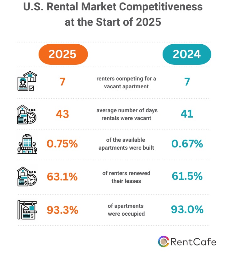 • Competition remains high nationwide: The Rental Competitiveness Index (RCI) for early 2025 sits at 75.7, signaling a highly competitive market. More renters are choosing to stay put due to limited supply and rising costs, keeping vacancy rates low.