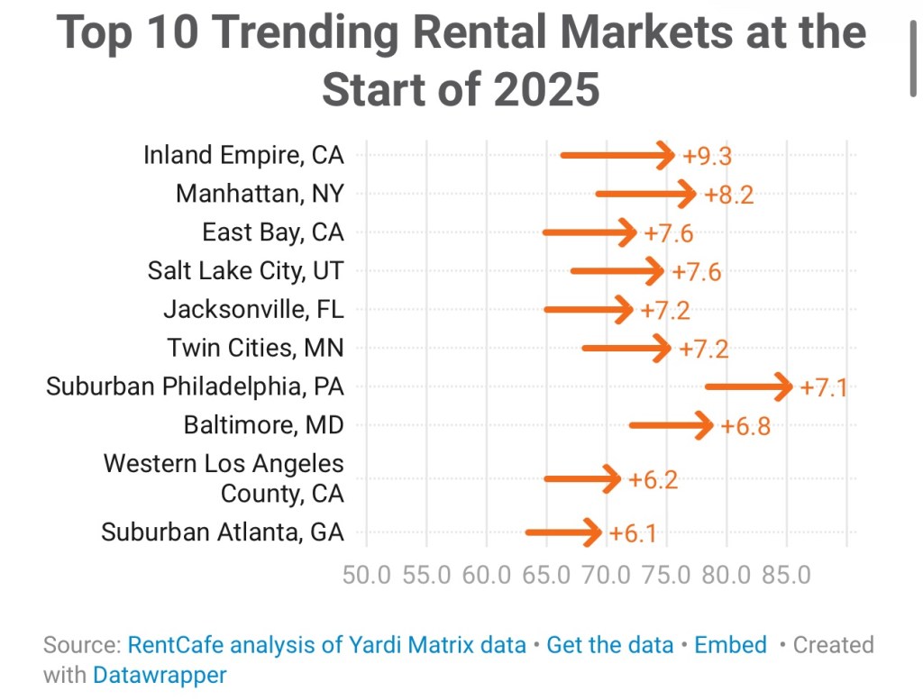 • Inland Empire & East Bay, CA – These California metros saw some of the biggest jumps in rental competition, largely due to migration from more expensive coastal cities and limited new construction.