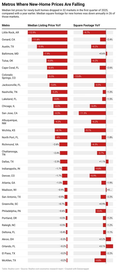 Take Little Rock, for example. New-home prices dropped a staggering 13% year-over-year in Q1 2025. But it’s not just the South. Markets like Dallas, Orlando, and Baltimore also saw price declines—even as home sizes grew in some of these areas.