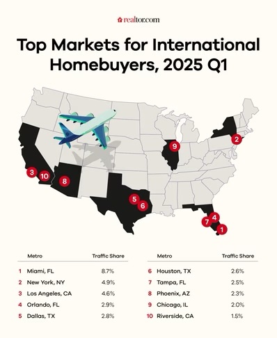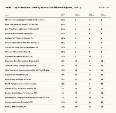 According to Realtor.com’s International Demand Report, Canadian interest in U.S. real estate fell sharply between Q4 2024 and Q1 2025. The country still ranks as the top source of international home shoppers, but its share of online traffic dropped from 40.7% to 34.7% in just a few months.
