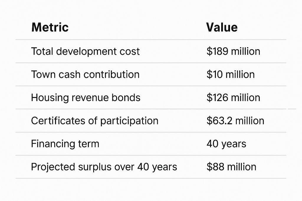 The council paired $10 million in equity with a May bond sale that locked in long-dated debt. Interest payments will be steep—$366.7 million if nothing is refinanced—but rent proceeds are modeled to cover debt service, operations, reserves, and still throw off cash. In other words, the town is trading balance-sheet capacity today for housing security tomorrow.