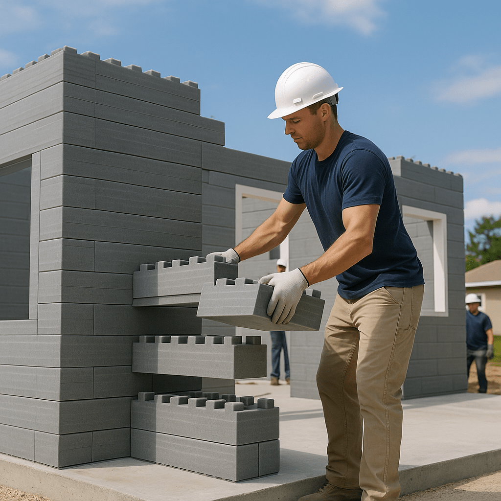 Renco isn’t just iterating on the old formula. They’ve created an entirely new building system: interlocking composite “bricks” made from recycled plastic and fiberglass that fit together like giant LEGOs. The system is so intuitive, it can be assembled by two unskilled workers in a day. No wood. No concrete. No steel.