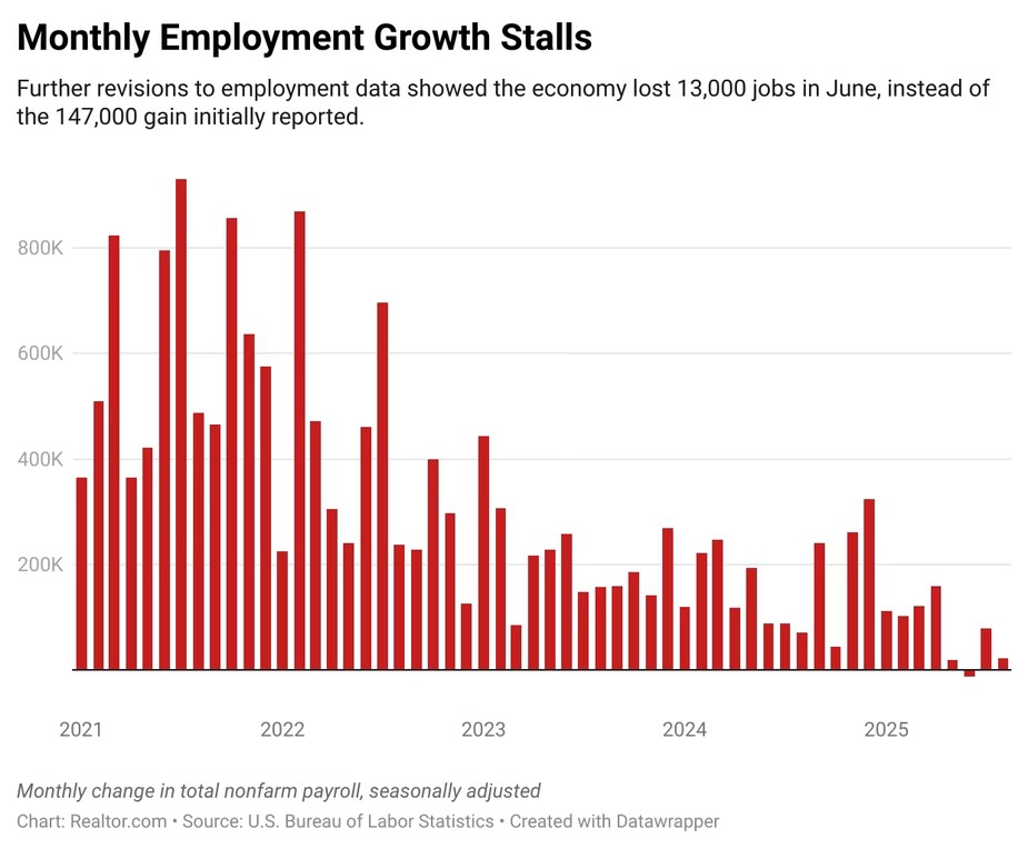 For those of us in real estate, this is a moment to pay attention. The macroeconomic data is troubling, but for homebuyers and sellers it means a window of opportunity is opening. Mortgage rates, already sliding to an 11-month low of 6.5%, are poised to fall further as the bond market prices in a weaker economy and multiple rate cuts.