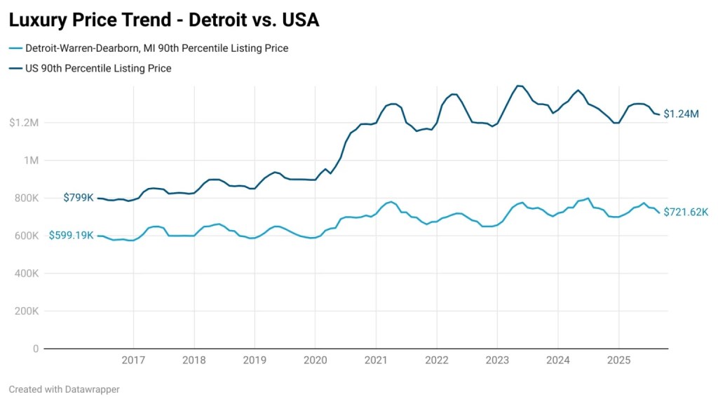 Detroit’s strength lies in its accessibility. The 90th percentile price for listings is $721,625, far below the national luxury threshold of $1.24 million. Even at the ultra-luxury level, Detroit’s 99th percentile listings average $2.84 million, roughly half the national benchmark of $5.41 million.