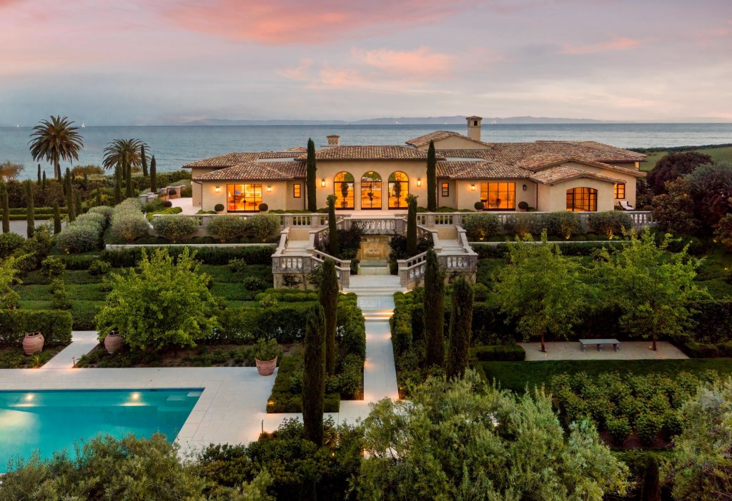 Located on the Gaviota Coast overlooking the ocean, El Rancho Tajiguas is a sustainable property comprising two villas, both LEED certified. Villa Della Costa, at 10,300 square feet, has five bedrooms, heated floors, swimming pool, pool cabana, movie theater, wine cellar, and guest house. The 12,000-square-foot Villa Del Mare also has five bedrooms, swimming pool, movie theater, wine cellar, and guest house. El Rancho’s 3,500 acres of grounds include active cattle rangeland, fruit orchards, and swaths of untouched landscape.